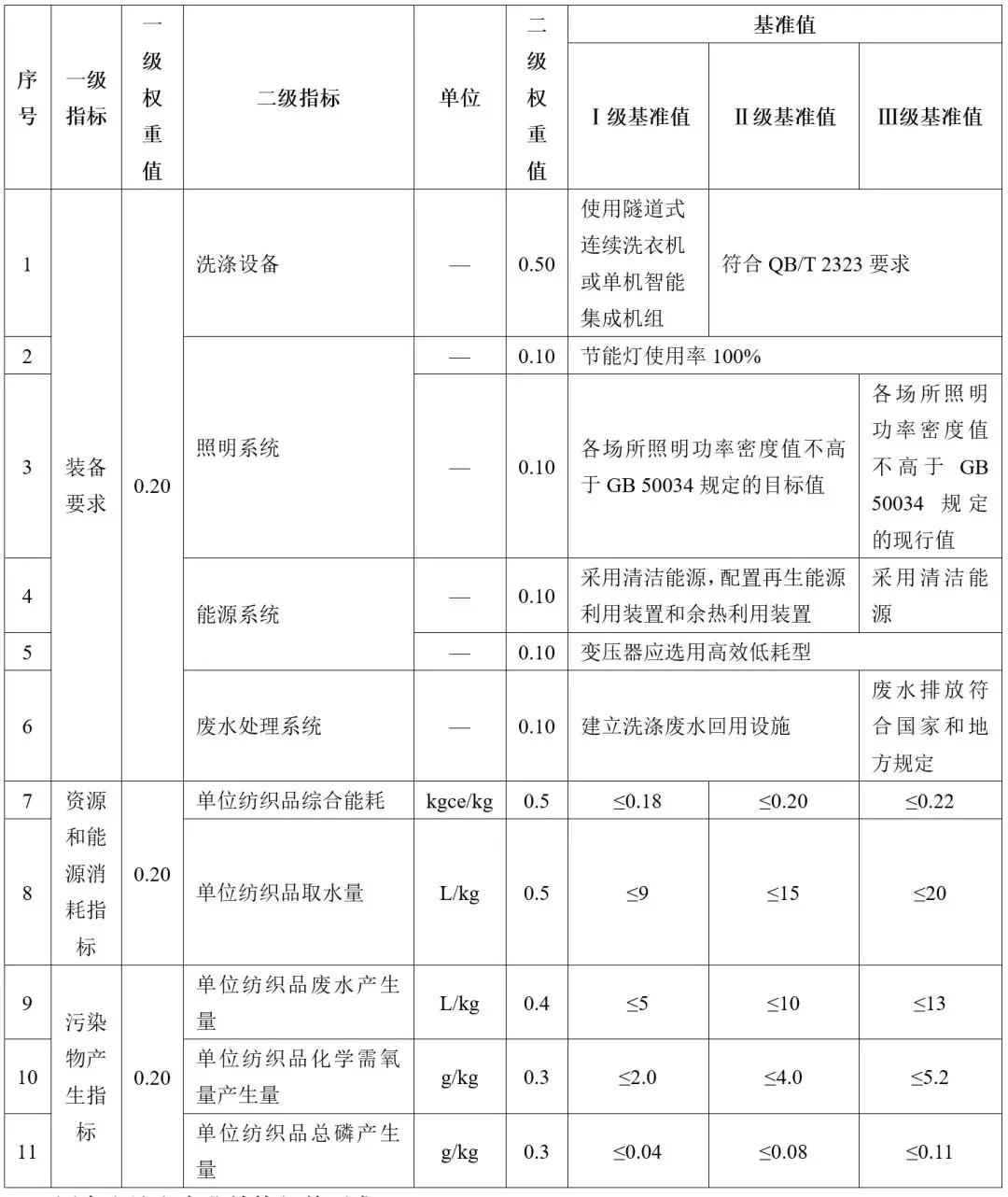 國家發(fā)改委、生態(tài)環(huán)境部、商務(wù)部于2018年12月29日頒布實(shí)施了《洗染業(yè)清潔生產(chǎn)評價(jià)指標(biāo)體系》(國家發(fā)改委 生態(tài)環(huán)境部 商務(wù)部 公告 2018年 第85號)?!吨笜?biāo)體系》適用于洗染企業(yè)的清潔生產(chǎn)審核、清潔生產(chǎn)潛力與機(jī)會的判斷以及清潔生產(chǎn)績效評定和清潔生產(chǎn)績效公告制度,也適用于環(huán)境影響評價(jià)、排污許可證管理、環(huán)保領(lǐng)跑者等環(huán)境管理制度。以公用紡織品為例,《指標(biāo)體系》部分內(nèi)容如下表所示。